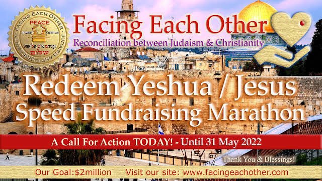 Please share with all friends who love Yeshua and Israel. Together we can make it happen; this time we go all the way, we are very near… “TODAY, if you will listen to HIS VOICE… Emanu-EL” (‘G-D is with us,’ in Hebrew). Please make an effort to reach out and invite your congregations, communities, larger circles with people of faith to join this action. We continue our Fundraising Marathon at the Facing-Each-Other to gather the $2 Million in order to enable the ceremony of Redeeming the Firstborn son (“Pidyon haBen” in Hebrew), on behalf of Yeshua and his public Retrial, for the formal return of Yeshua back to the Jewish people and to reach full Reconciliation between Judaism and Christianity.